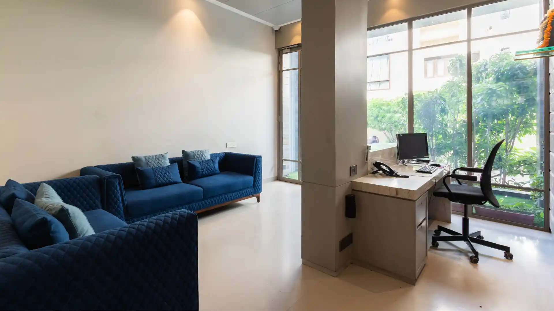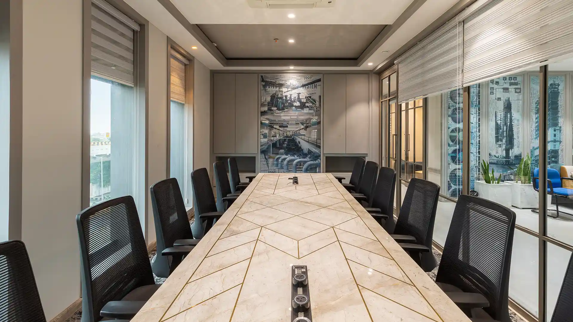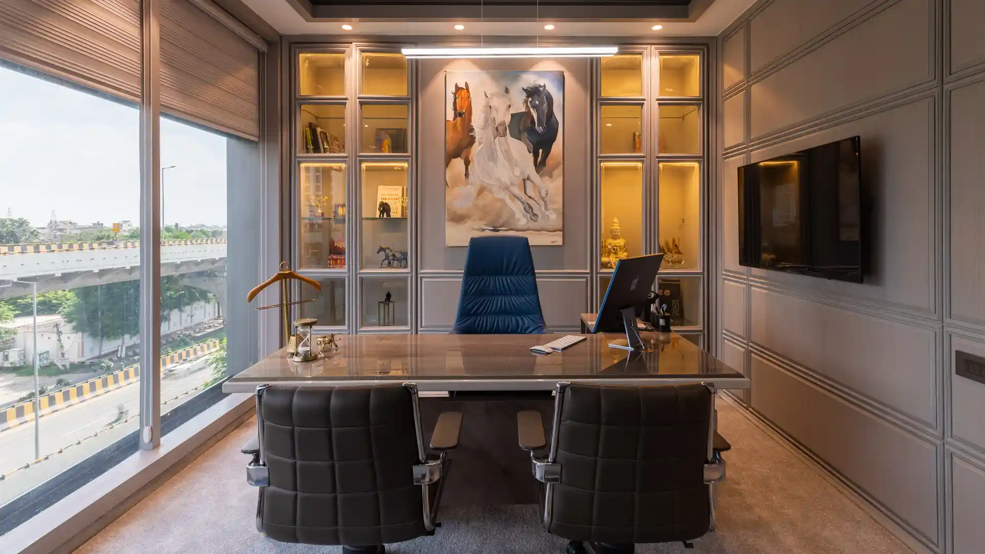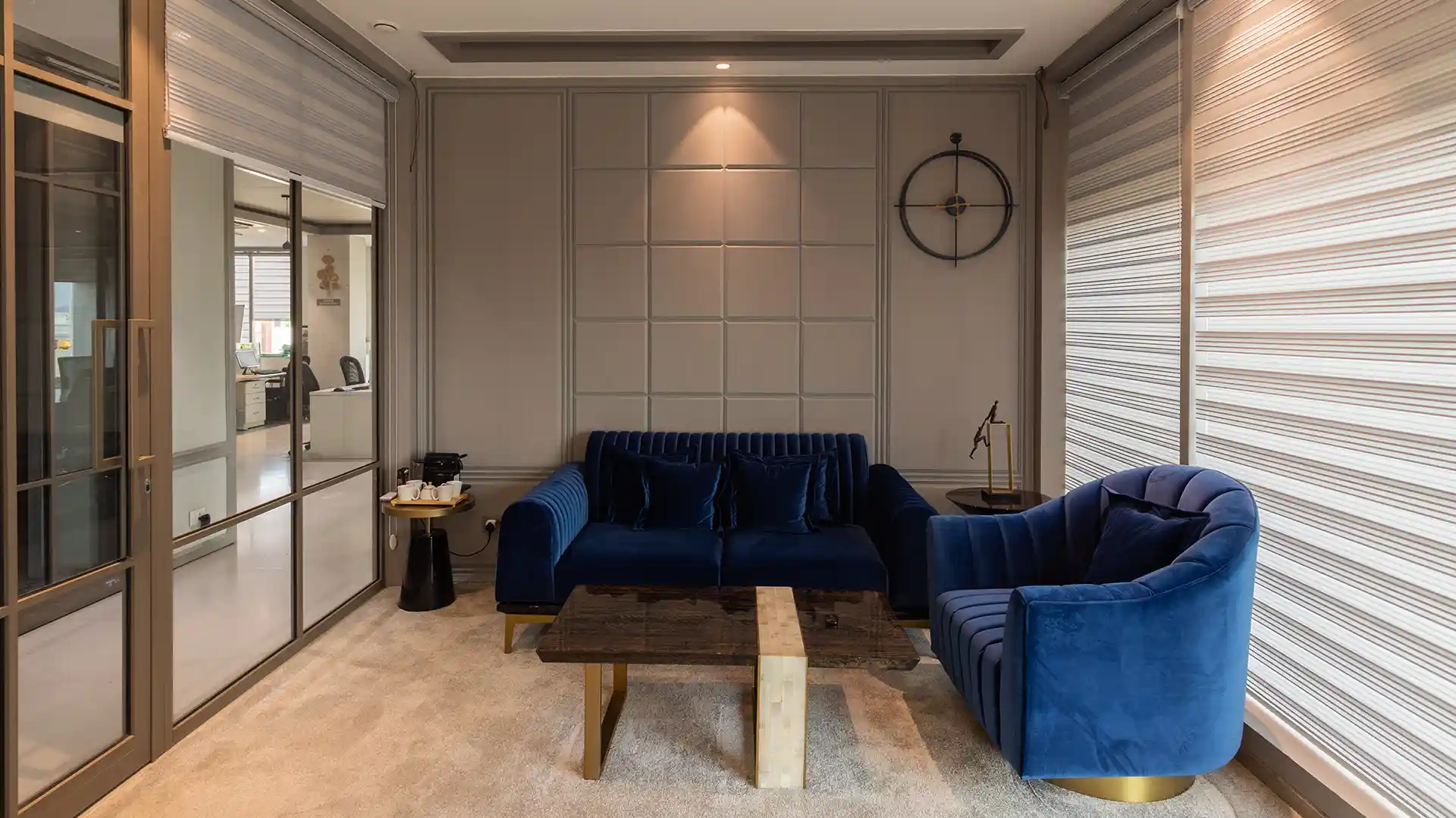 The second floor is dedicated to individual cabins and meeting rooms, fostering unique aesthetics. The cabin is designed to offer ample natural light with glass windows and simple artificial lighting. The third floor includes the director’s cabin and private meeting rooms. All these spaces follow a colour palette that combines grey and blue tones. The workplace focuses on tasks relating to water, thus it makes sense that these colours represent water. Further, the fourth and fifth floors are designated for private bedroom spaces along with a penthouse for party areas. These cater to the various needs of the occupants.