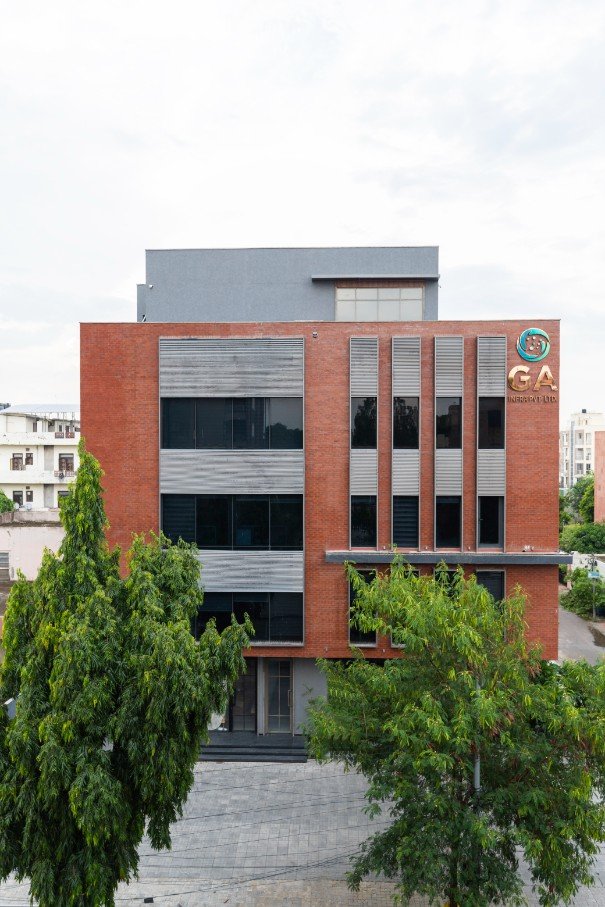 As the world of office and commercial spaces evolves, the modern workspace landscape has transformed into new heights of convenience. The design makes a bold statement with its facade, a cladding made of stone and brick that has a textured, eye-catching appearance. Zoned across five storeys, including two basements, the office space meets the requirements of the clients and the employees. The basement includes parking and main work areas which extend to the first floor.